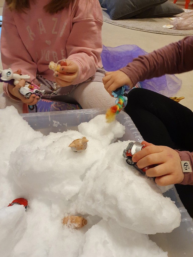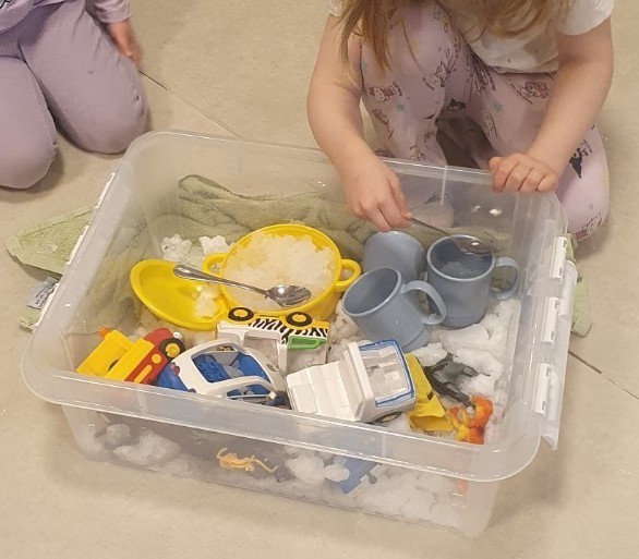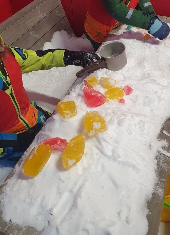 Januar har vært preget av kaldt vintervær, og vi har brukt dette som utgangspunkt for lek, utforsking og læring – både inne og ute. Når temperaturen har vært for lav for lengre utelek, har vi tatt snø med inn på avdeling. Barna har fått undersøke snø gjennom sansene; kjenne på kulde, observere hvordan snø smelter og blir til vann, og samtale om endringer i form og tilstand. Dette støtter barnas nysgjerrighet og forståelse for naturfenomener.